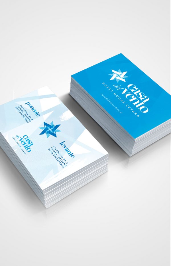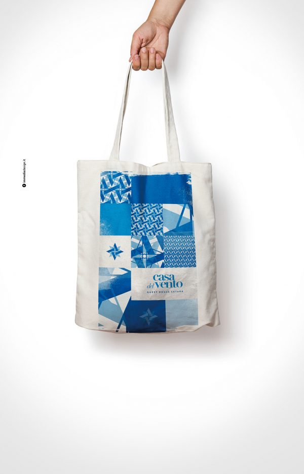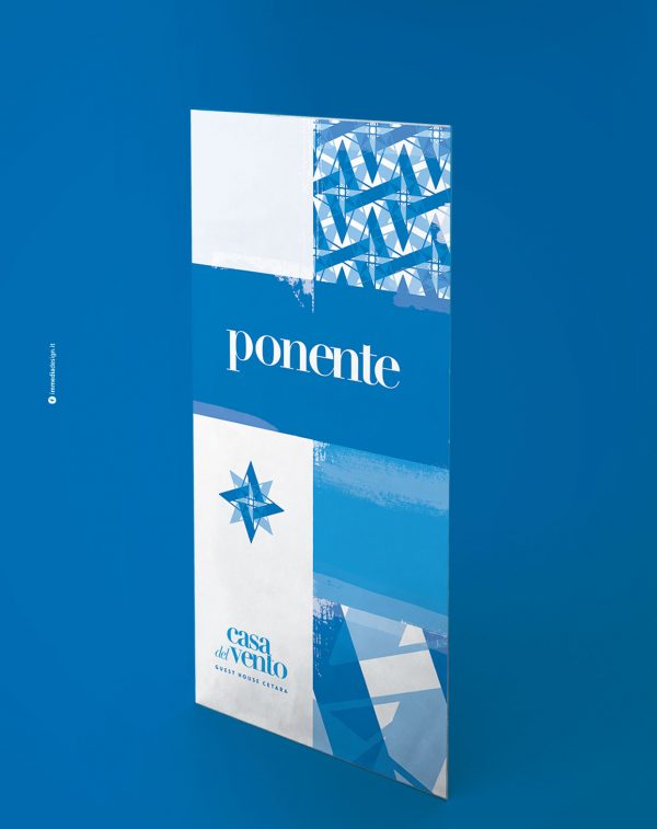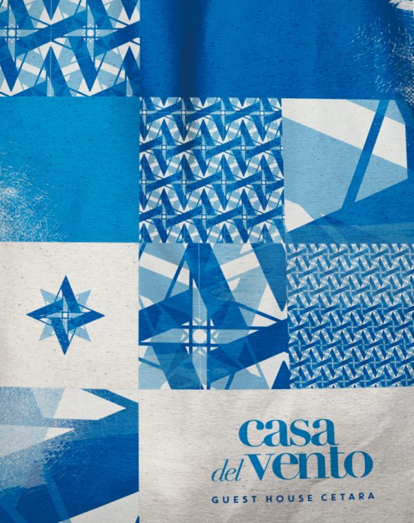 Segno evocativo, riconoscibile, diretto, la rosa dei venti del pittogramma si costruisce sulla “V” del lettering. Ne deriva una texture armonica che, nelle diverse applicazioni, si allarga o si restringe, esaltando le geometrie visive del marchio. Le cromie dei blu, le sovrapposizioni, i fondi pieni di colore, i tagli geometrici sono utilizzati come pennellate irregolari, dando forma a pattern simili alle maioliche e ceramiche vietresi.