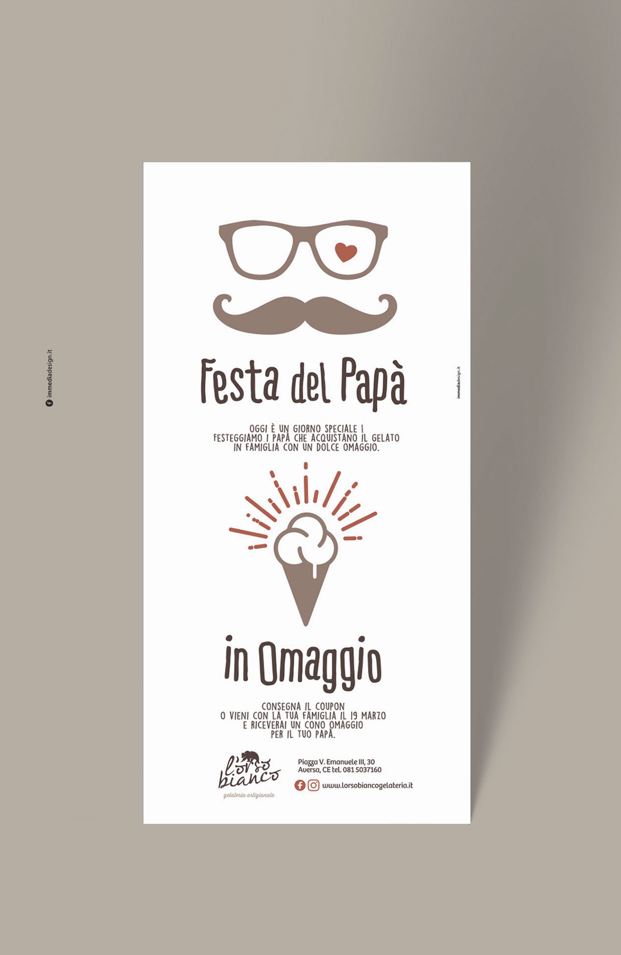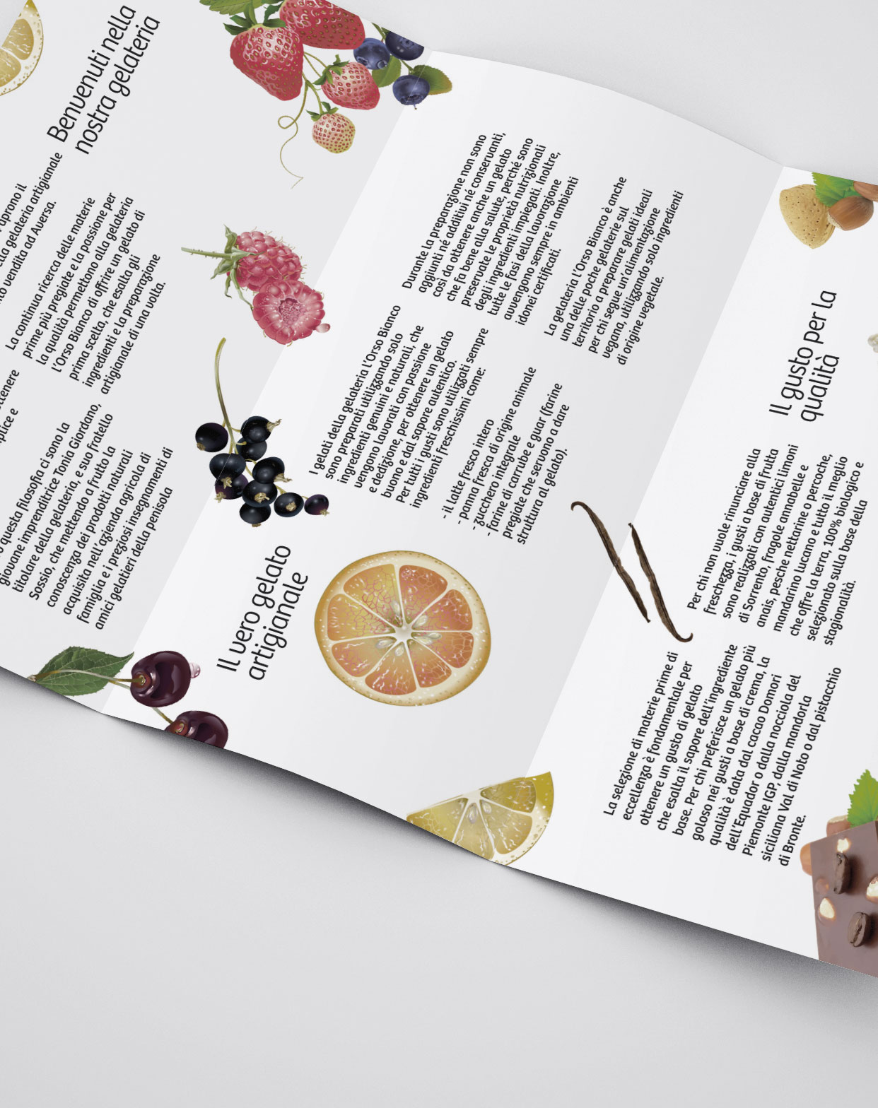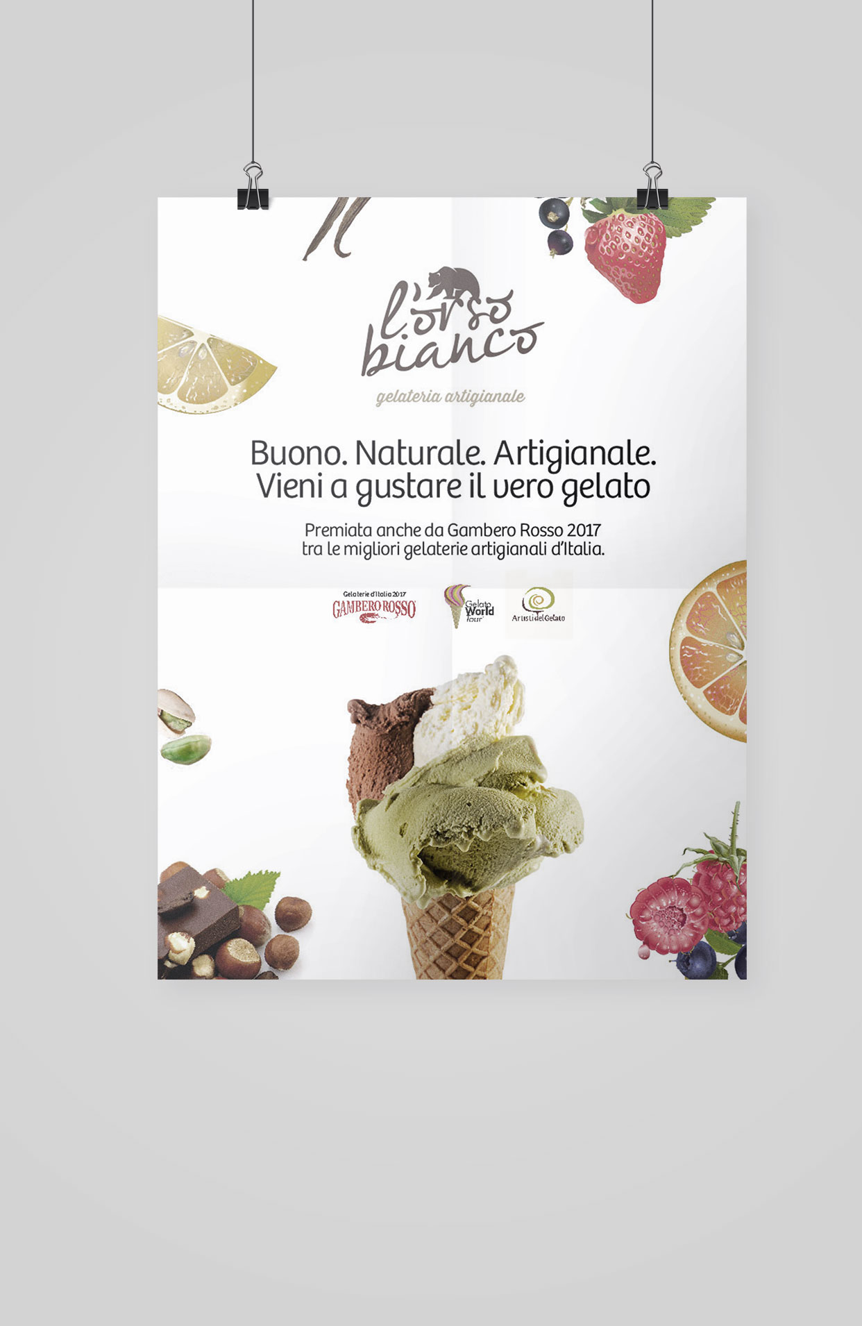 Le calde tonalità del nocciola e del cioccolato, ispirate alla naturalità degli ingredienti utilizzati, completano l’identità visiva della gelateria artigianale l’Orso Bianco. Un marchio che è la firma della gelateria e delle sue bontà.