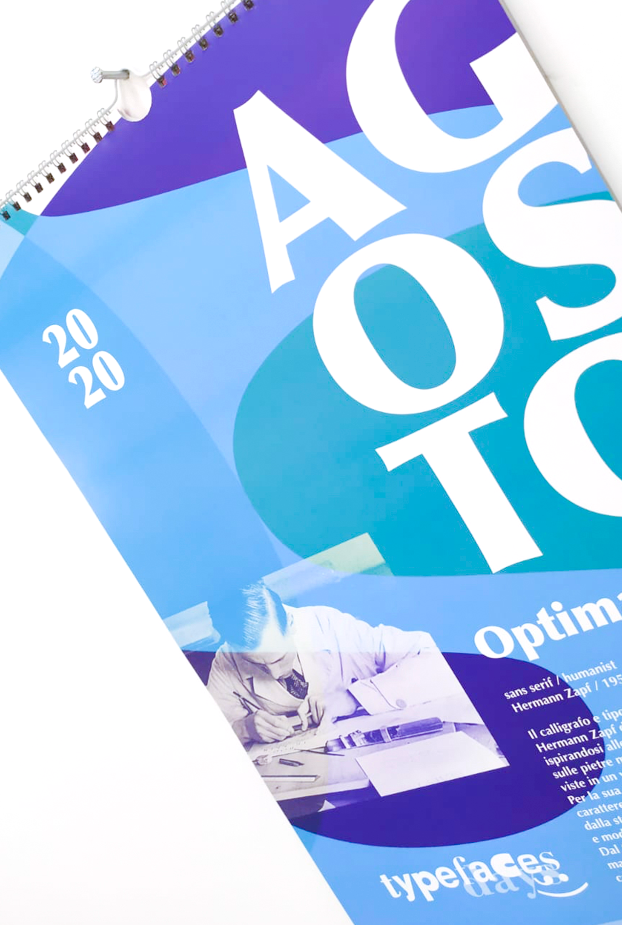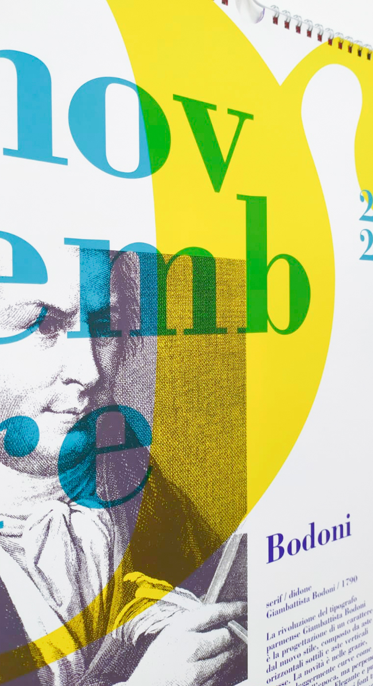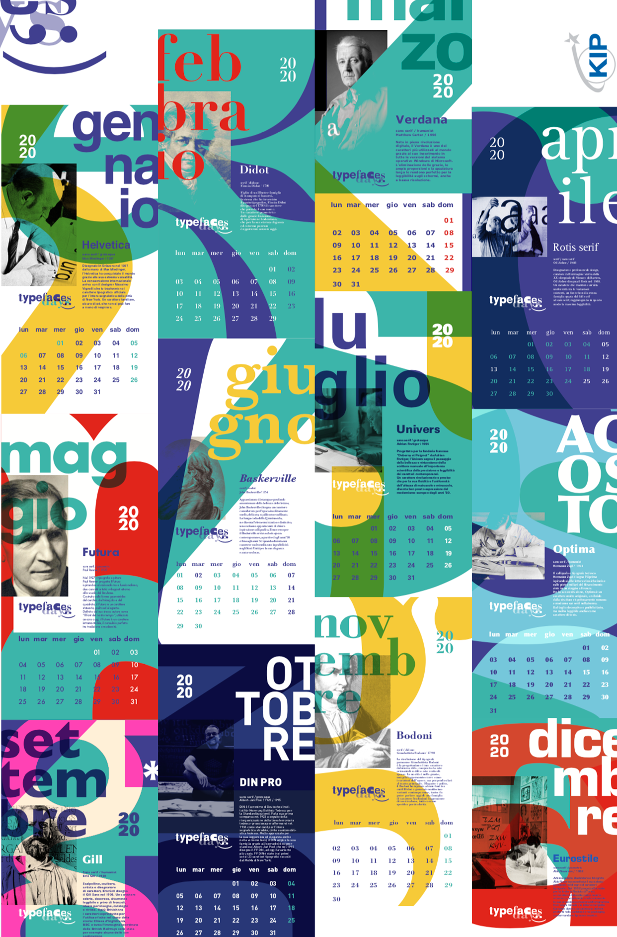 Per la progettazione del calendario, i mesi raccontano le storie di alcuni font e dei loro designer rivoluzionari nella storia delle parole disegnate.