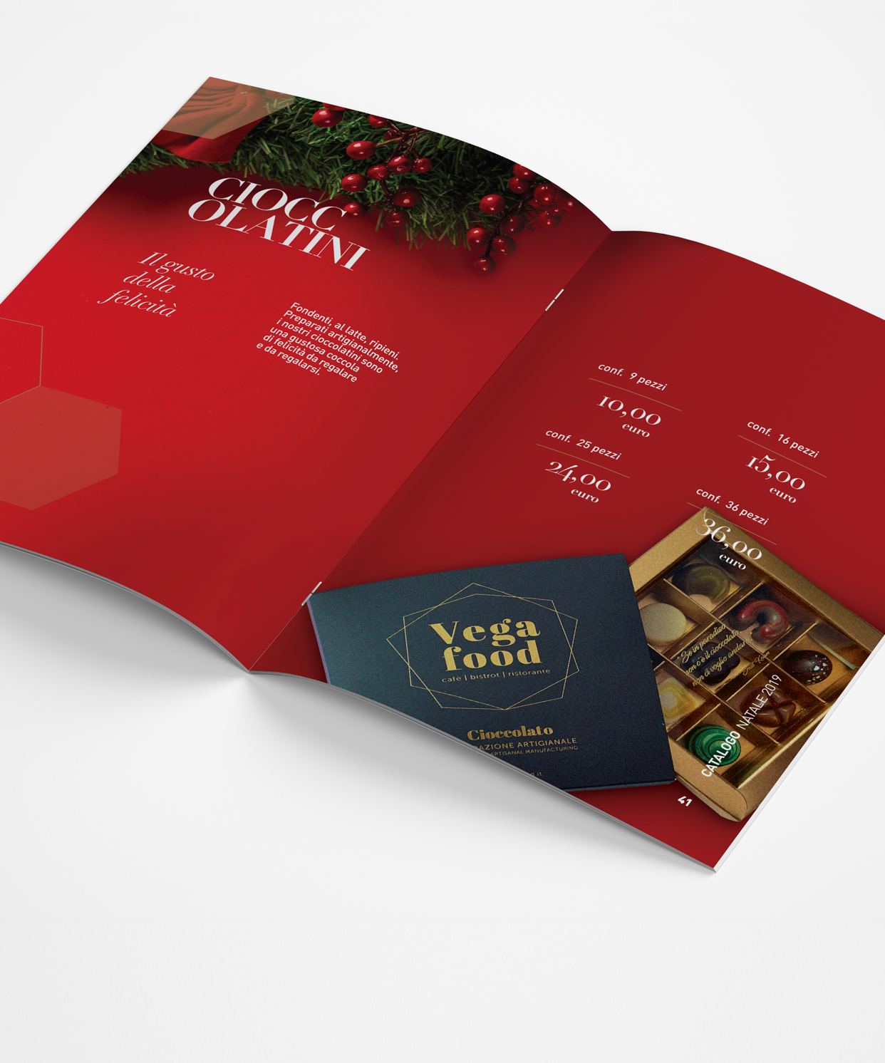 Stiloso ed elegante il Natale di Vega Food, caffè bistrot e ristorante del gruppo Marican. Quest’anno per uno dei nostri clienti storici, lo studio Immedia si è ispirato alle sfumature e ai colori delle feste per progettare packaging e catalogo di Natale, valorizzando l’identità visiva del bistrot.