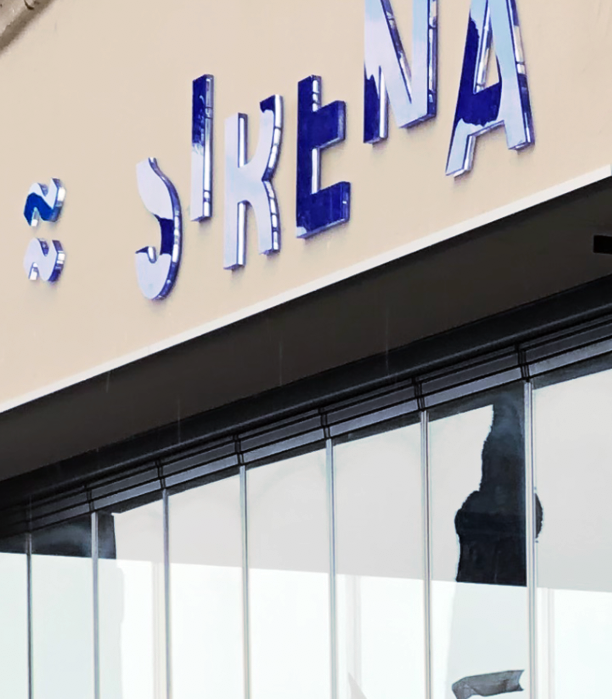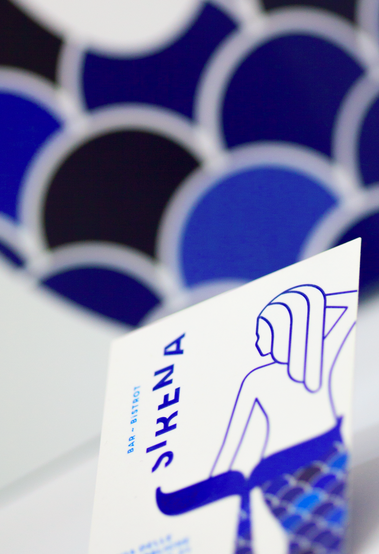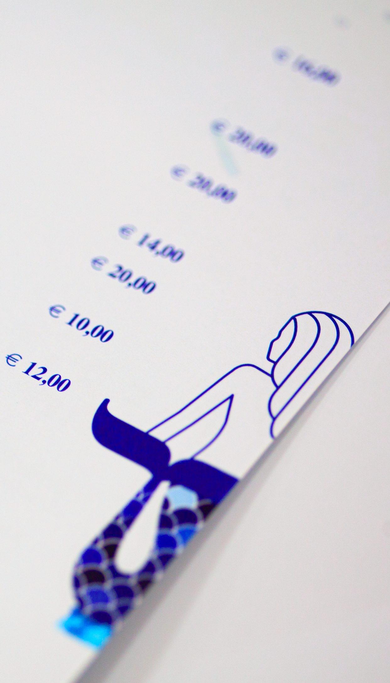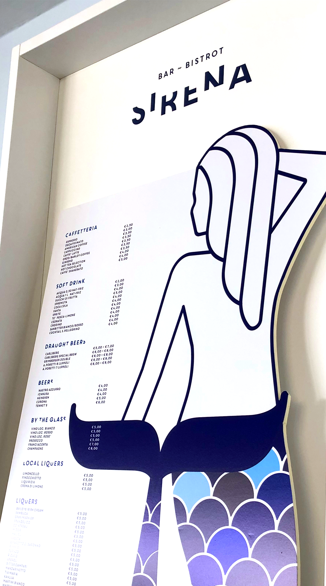 La coda diventa l’elemento distintivo del marchio, ripetendosi sull’intero coordinato a partire dall’insegna, in cui il busto della sirena completa la colonna tortile all’ingresso che si trasforma in una coda.