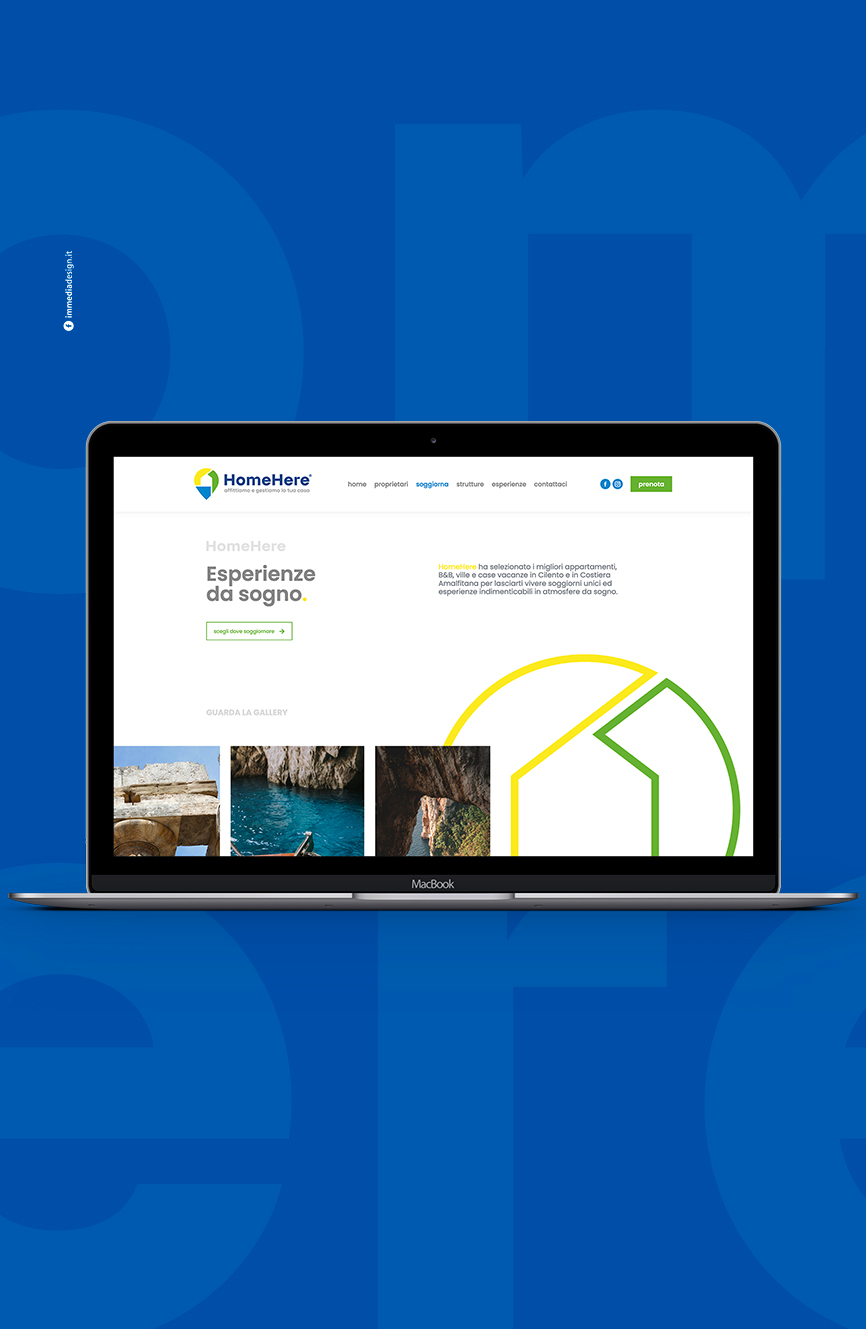 Lo studio Immedia ha anche sviluppato il sito web, coordinandolo all’identità visiva e al core business. Anche il sito, come il property manager, infatti si rivolge a entrambe i target: proprietari e turisti, rispecchiando e rispettando la doppia anima di Home Here e la professionalità di Francesco Lodato.