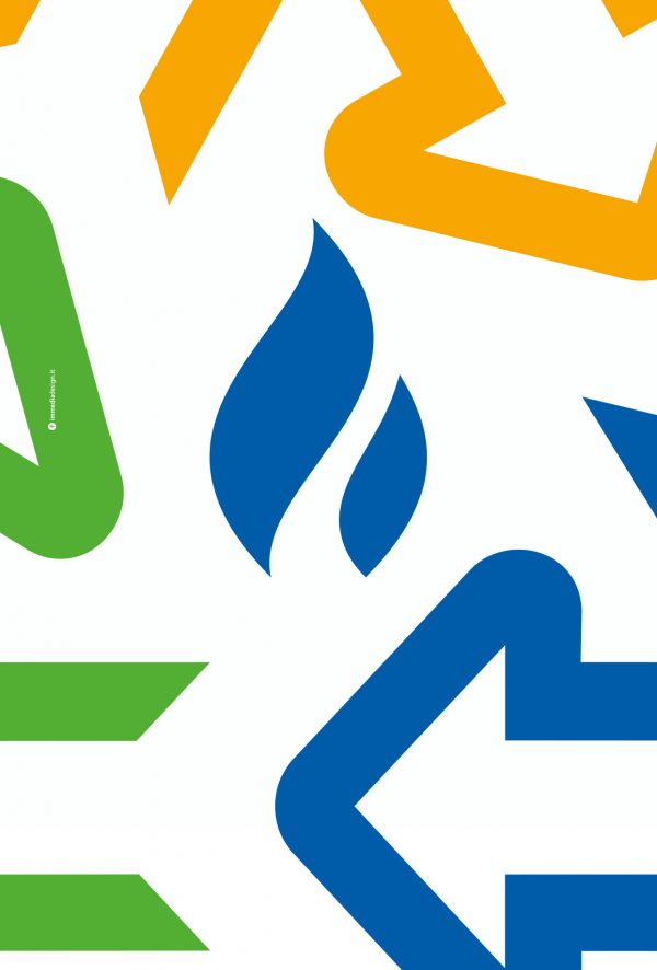 Inscritto in un rettangolo aureo, il marchio mantiene nel pittogramma lo stesso spessore del lettering, raggiungendo il giusto equilibrio delle proporzioni. Gli angoli smussati del font riprendono la curvatura del simbolo del riciclo, creando dinamicità e movimento del marchio.