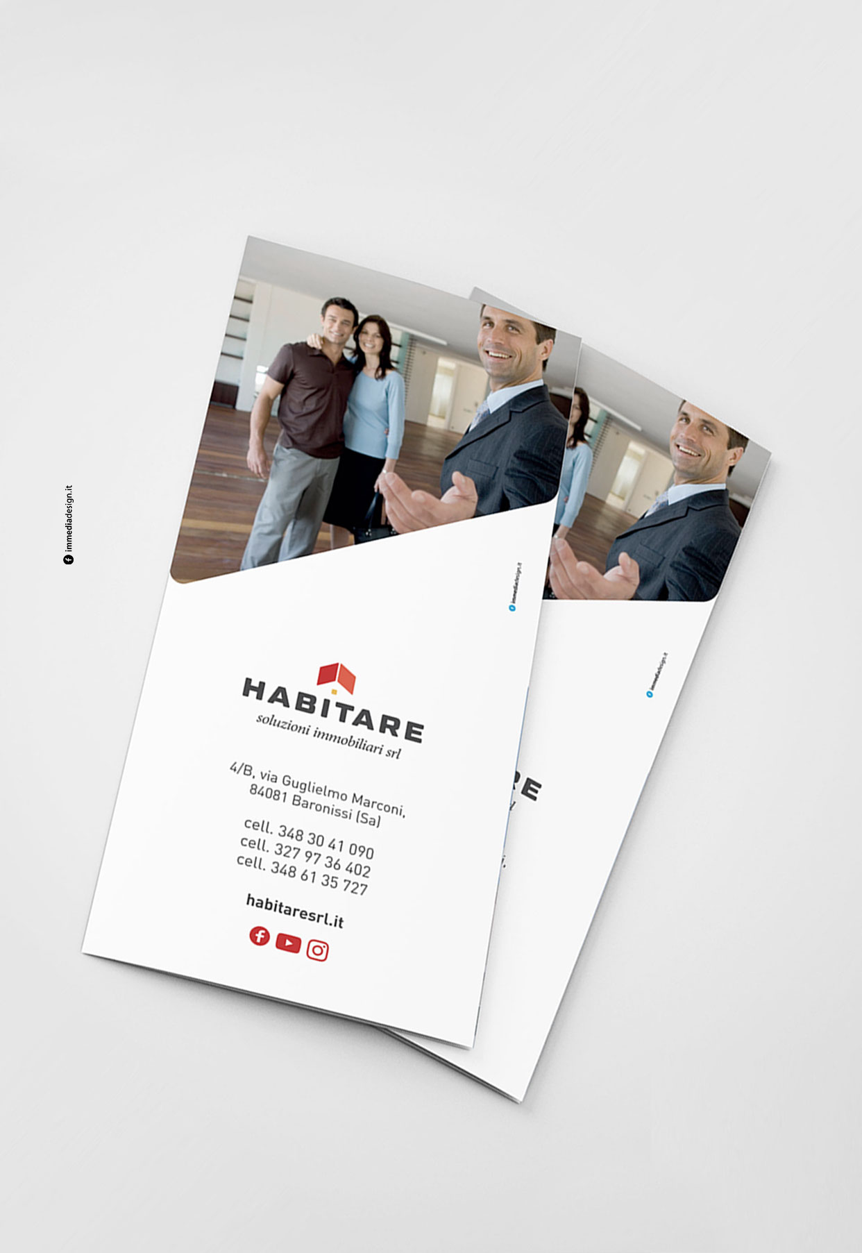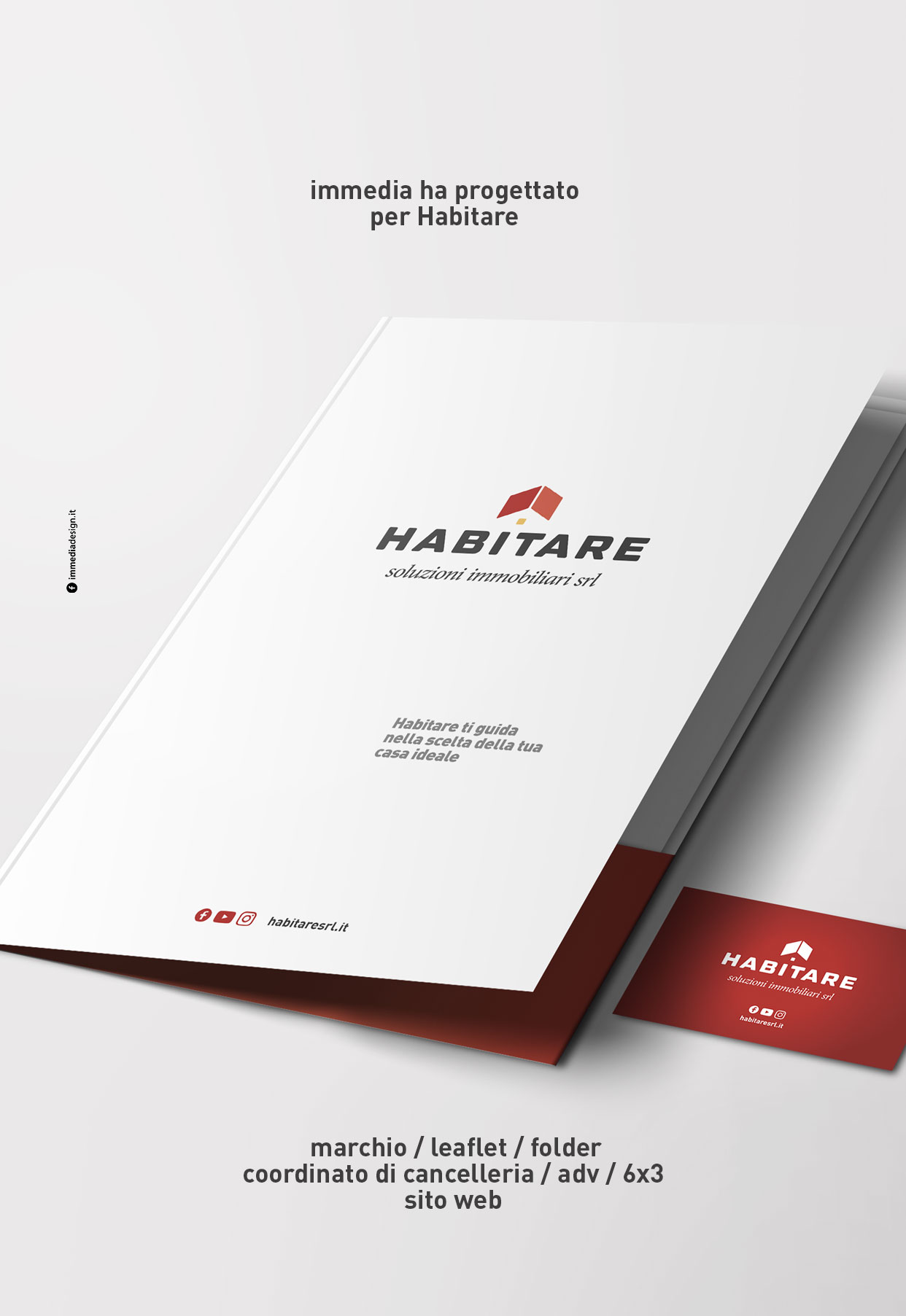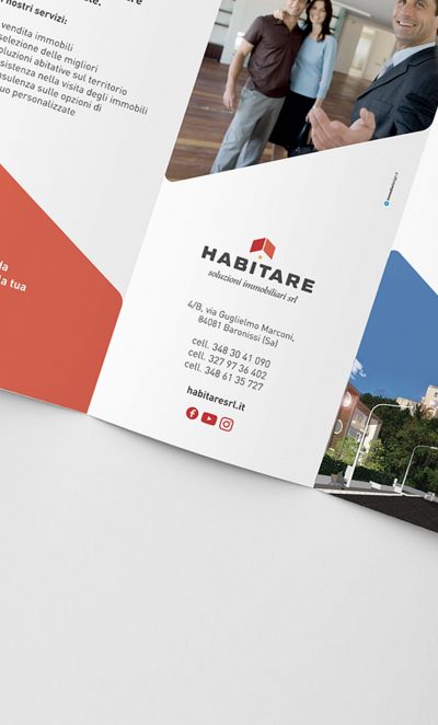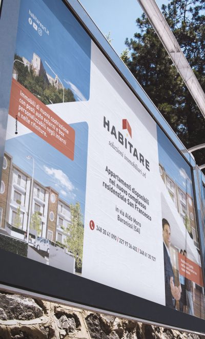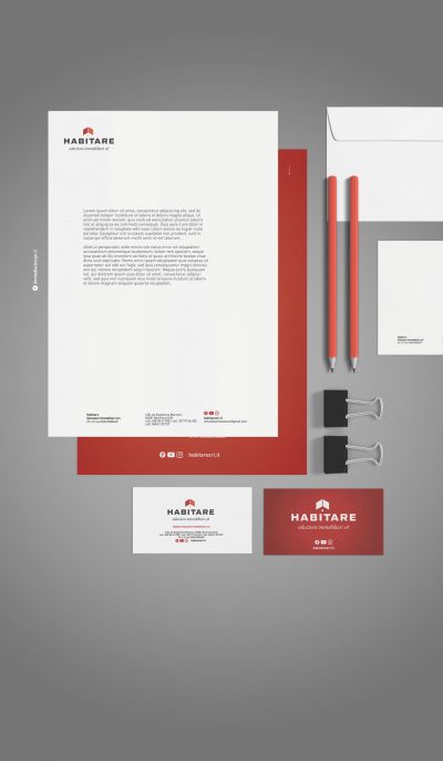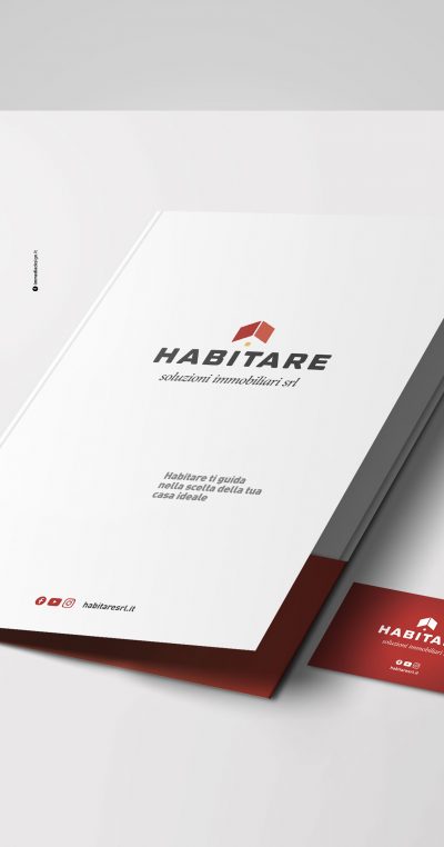 Il logo, strutturato, stabile, ricco di personalità, infonde professionalità, fiducia e competenza, valori che i consulenti di Habitare trasmettono ai propri clienti, mentre nel pittogramma è ben visibile il profilo stilizzato di una casa. Geometrico, squadrato, solido, il lettering scelto è versatile, visibile e sempre ben definito su tutti i materiali di comunicazione, cartacei e digitali.