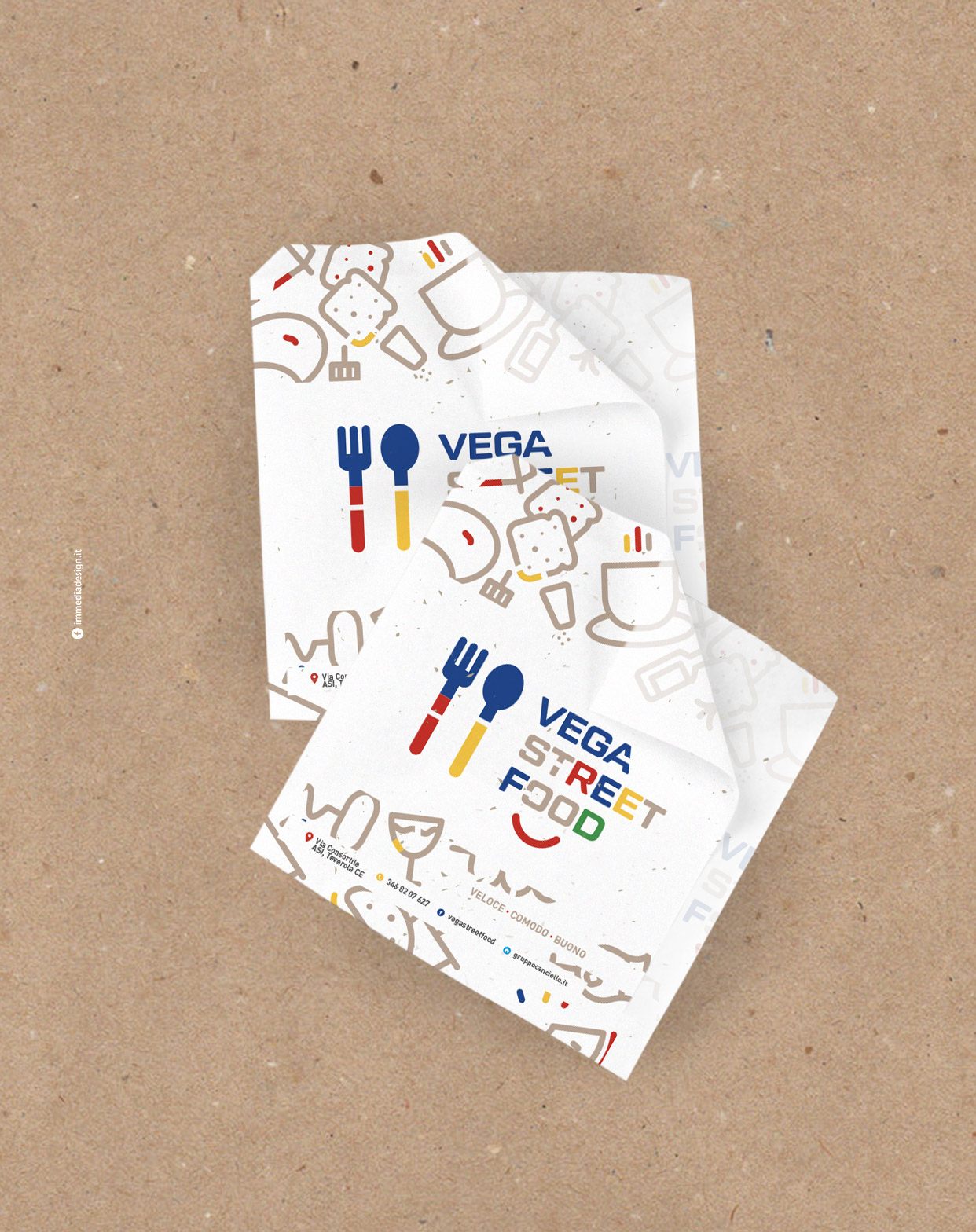 Iconico e informativo, il pittogramma definisce immediatamente il settore di appartenenza, mentre i tagli orizzontali sono tipici della tecnica dello stencil molto utilizzata nel mondo della street art. L’intento è quello di collocare il marchio nell’universo del cibo di strada, finalità rafforzata anche dalla tag-line “Veloce, comodo, buono”, che sintetizza le qualità della gastronomia del nuovo punto ristoro.