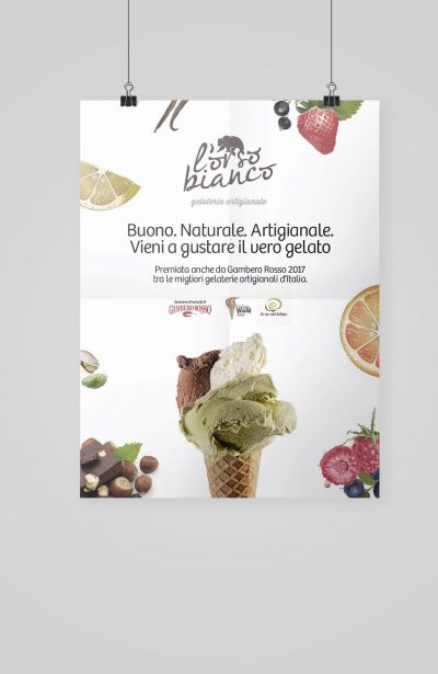 Il gelato è un condensato di felicità, un mondo fatto di gusto, dolcezza e bontà, in cui ingredienti semplici vengono combinati e trasformati dalla sapiente lavorazione dei maestri gelatai in morbide e gustose bontà artigianali. Nasce da queste premesse il logo per L’Orso Bianco, gelateria artigianale di Aversa, che ogni giorno si impegna nella preparazione del vero gelato artigianale, fatto solo con ingredienti naturali e materie prime di qualità.