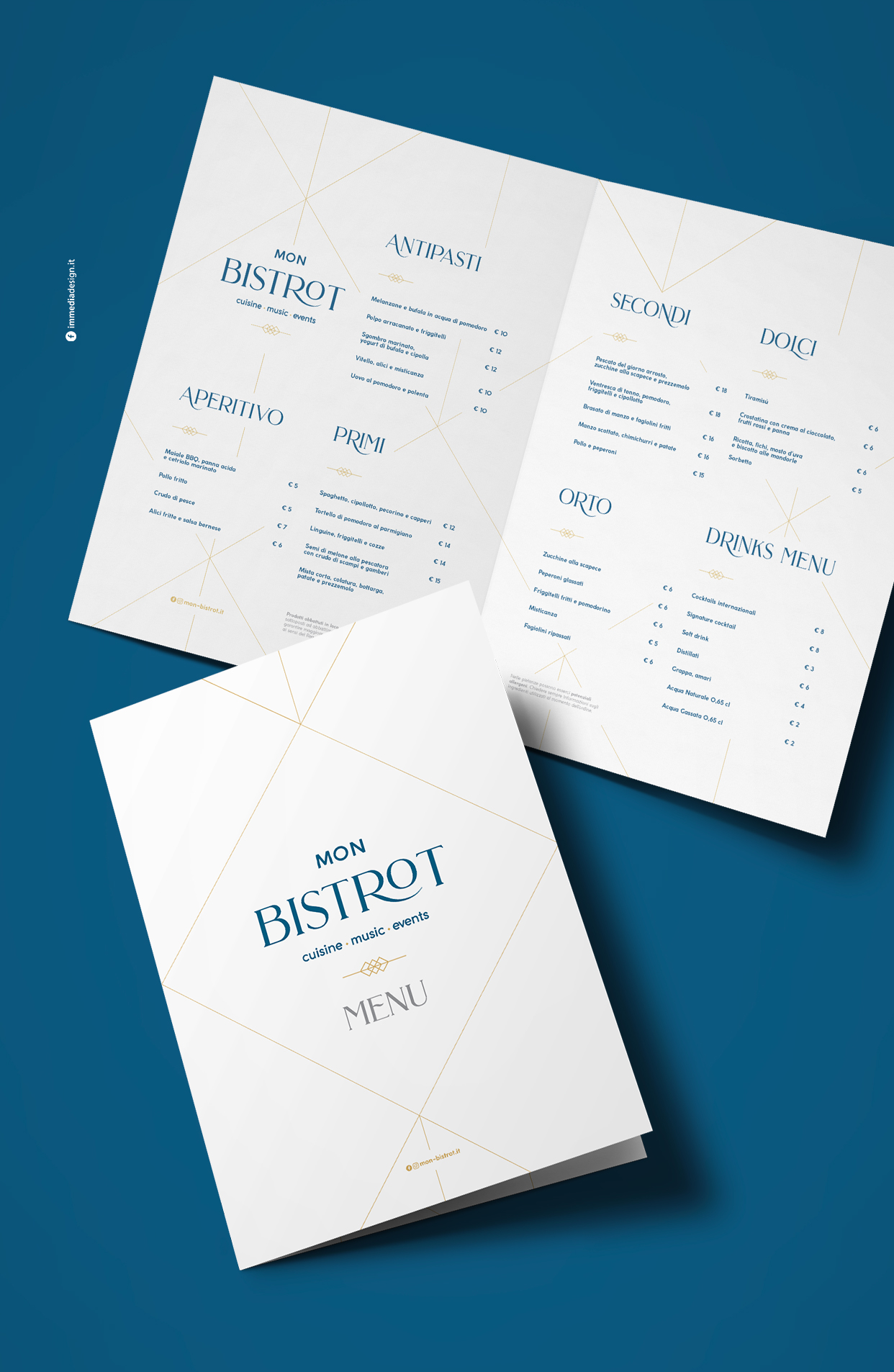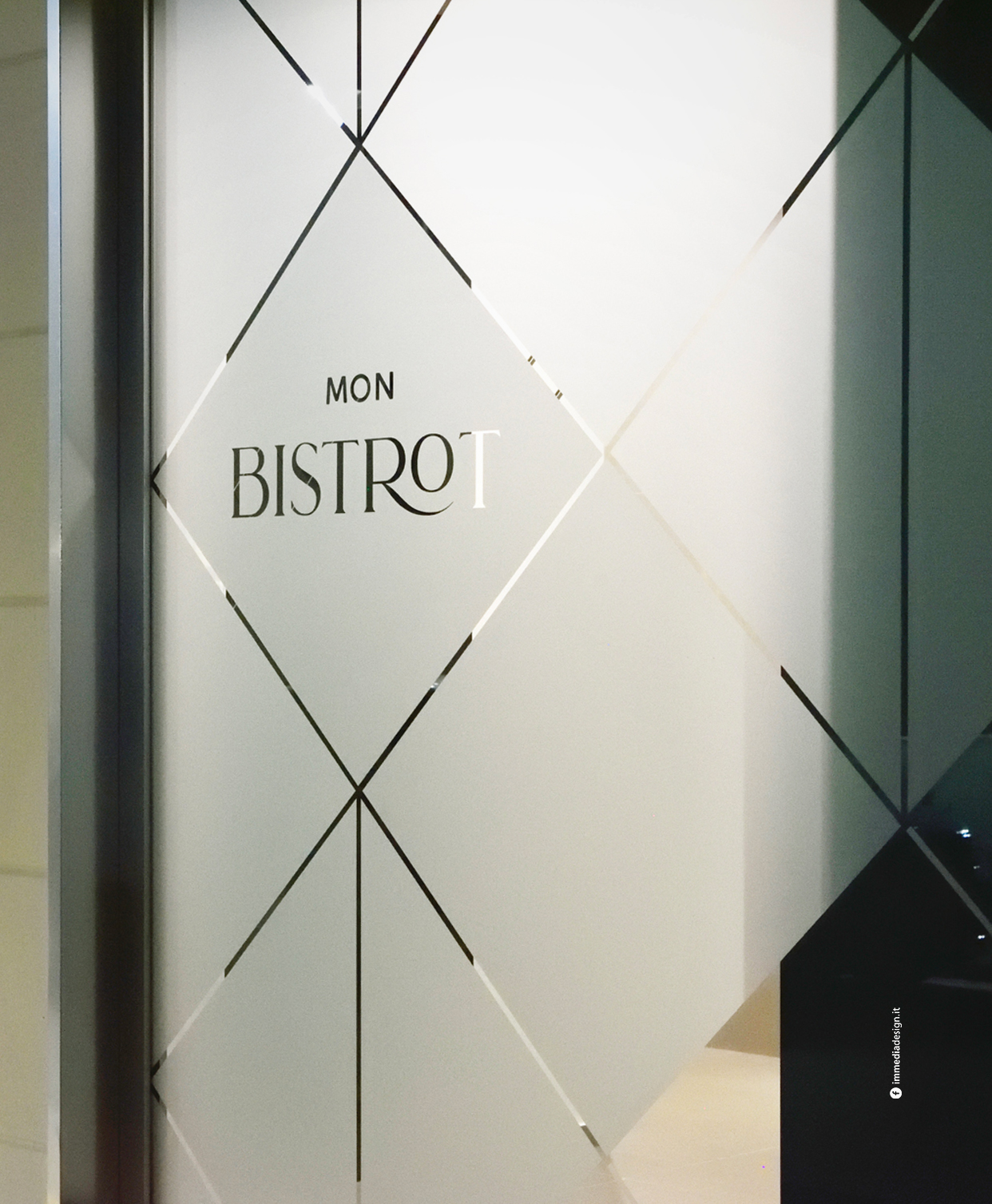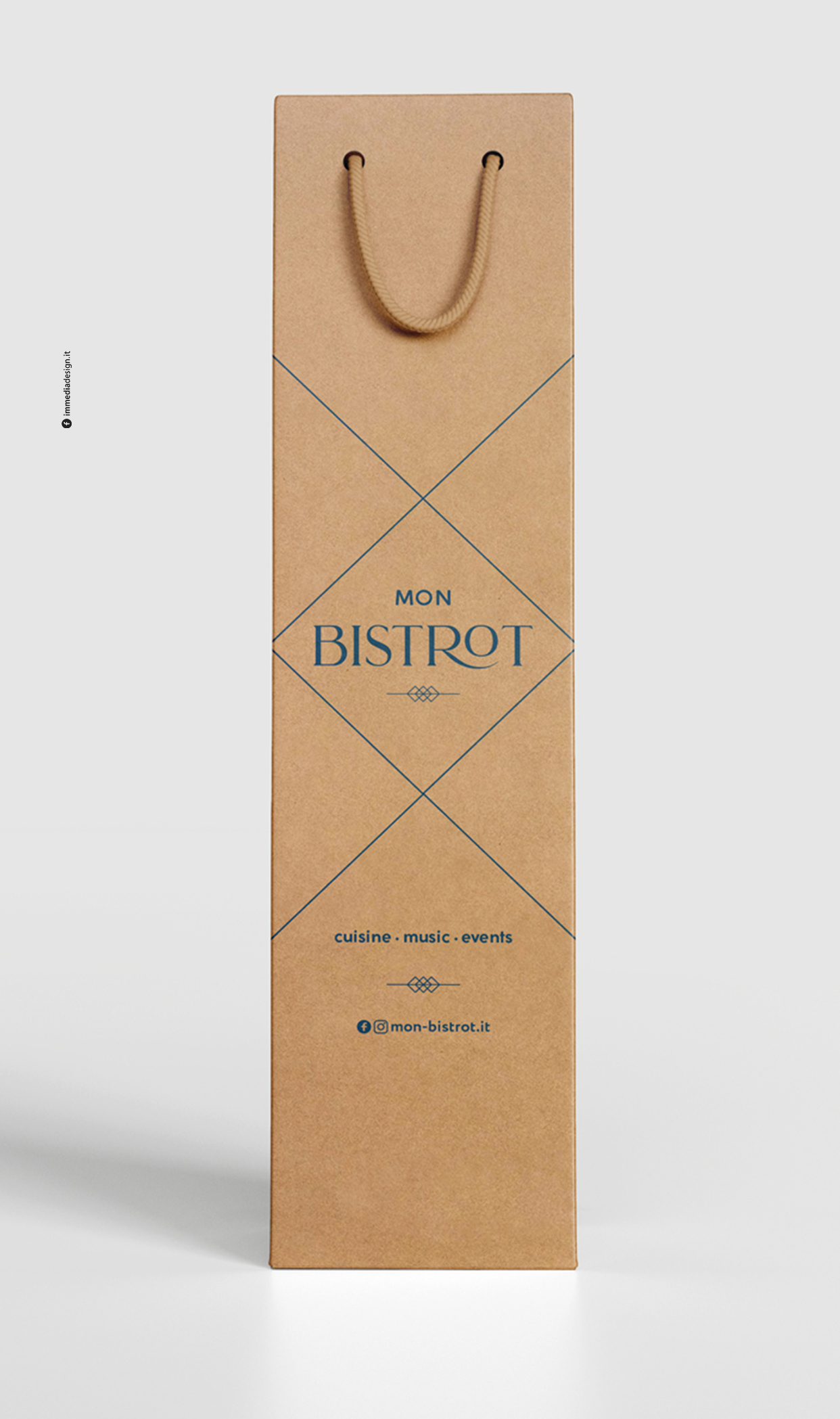 La parola francese “Mon” (Mio), sottolinea uno spazio pensato e progettato esclusivamente per i clienti. La tag “cuisine – music – events” (cucina – musica – eventi) evidenzia i momenti e le occasioni da vivere e sperimentare da Mon Bistrot. Un respiro volutamente internazionale per naming e tag, in cui si accostano francese e inglese, sottolineando anche la vocazione del locale. Marchio e tag sono iscritti all’interno di un rombo, elemento geometrico che riprende gli interni, i pavimenti e diversi elementi decorativi del locale.
