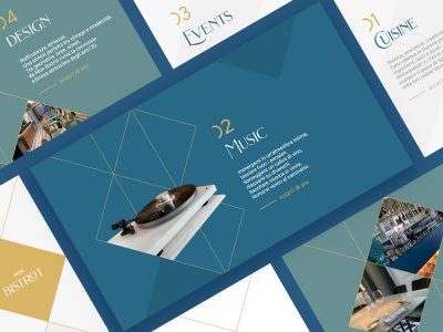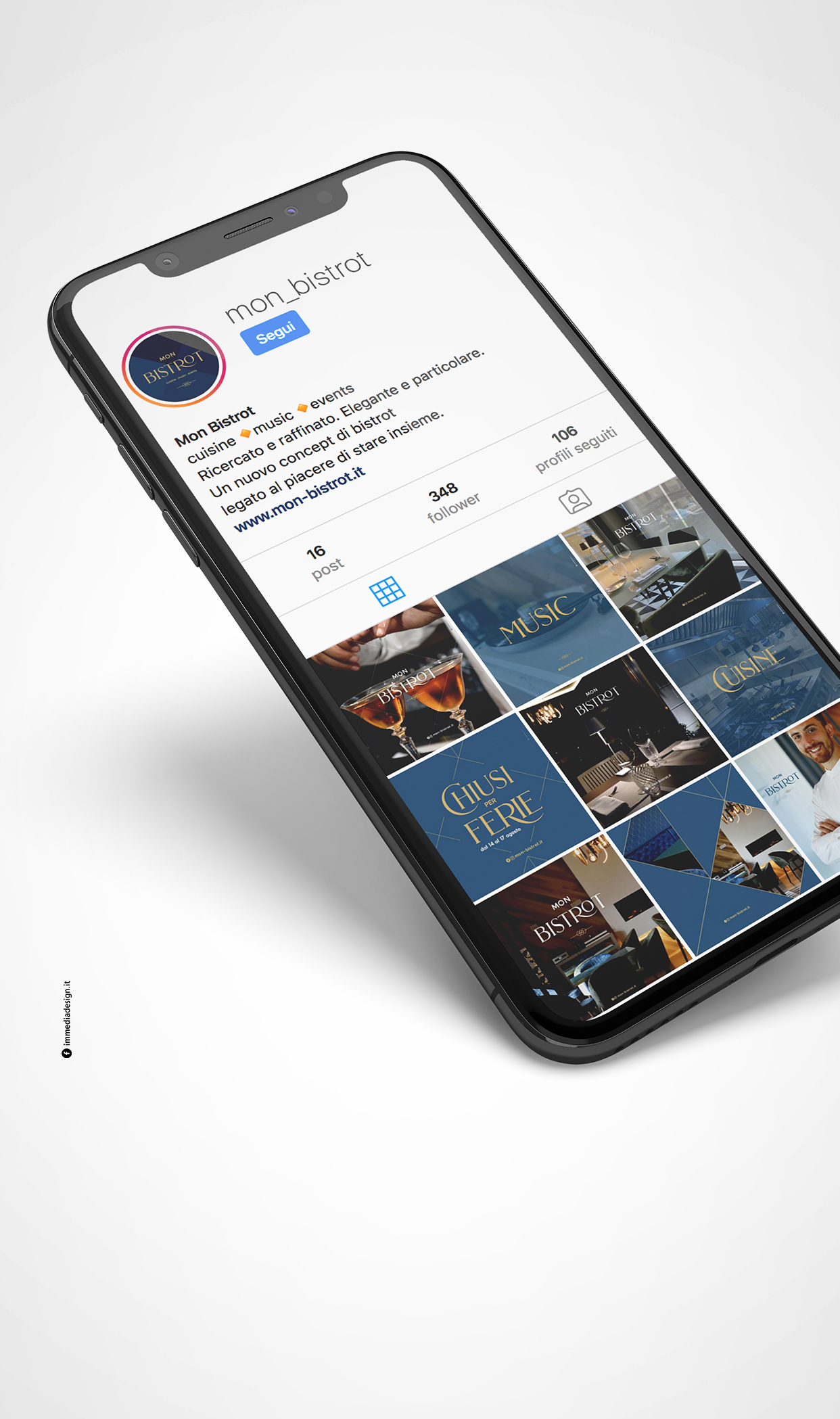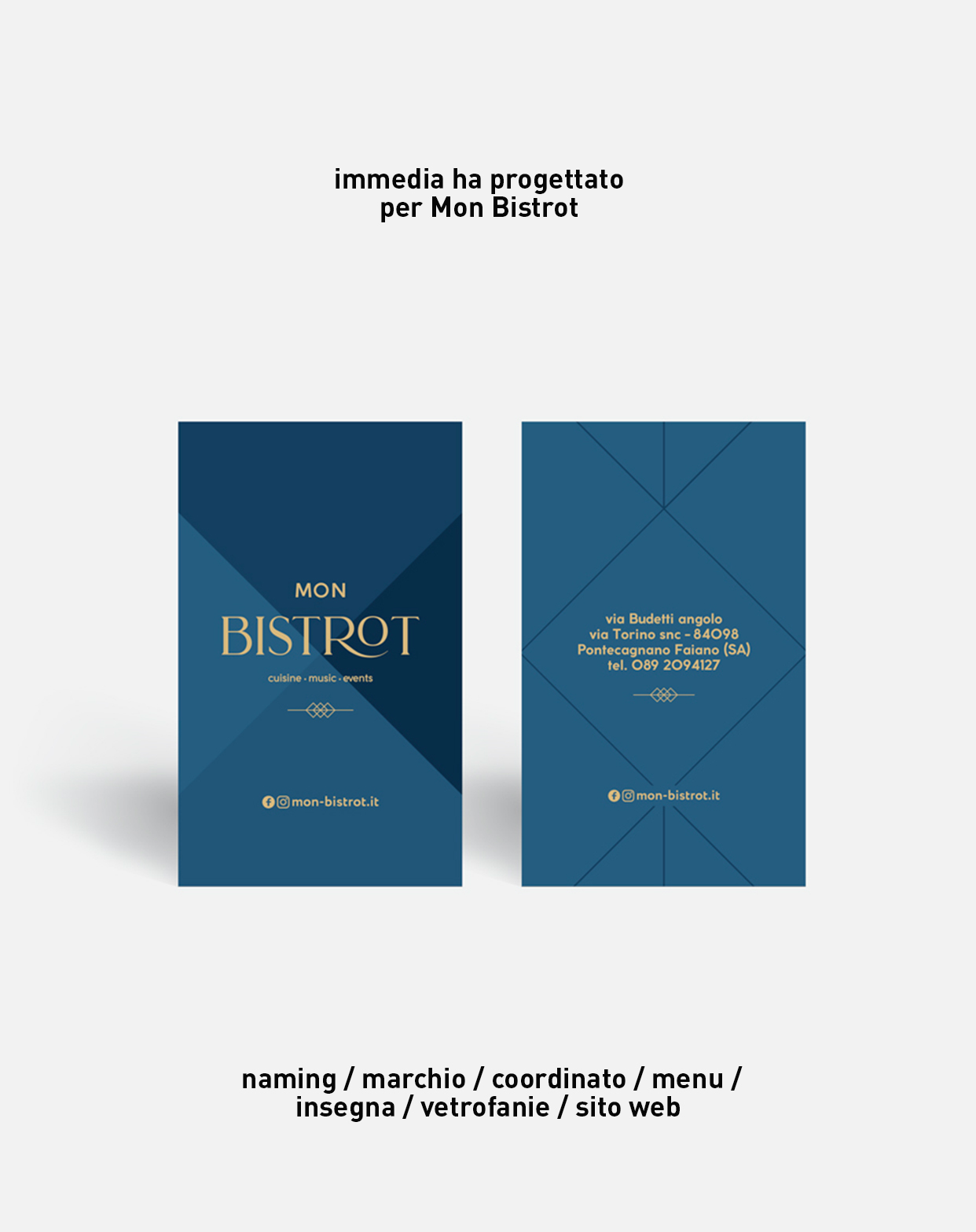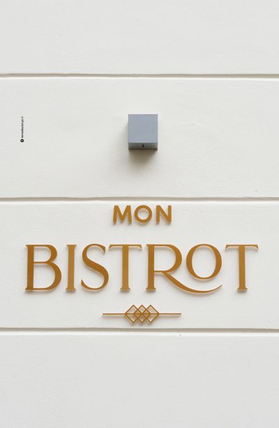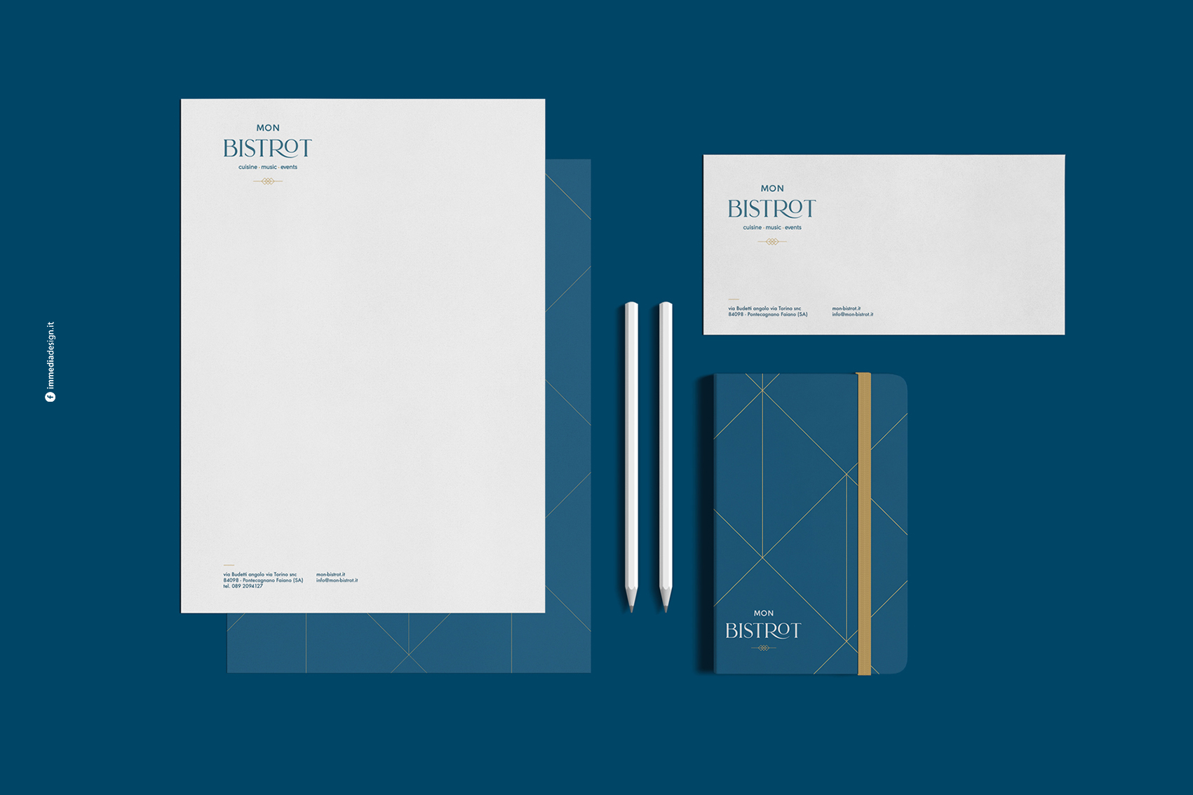La parola francese “Mon” (Mio), sottolinea uno spazio pensato e progettato esclusivamente per i clienti. La tag “cuisine – music – events” (cucina – musica – eventi) evidenzia i momenti e le occasioni da vivere e sperimentare da Mon Bistrot. Un respiro volutamente internazionale per naming e tag, in cui si accostano francese e inglese, sottolineando anche la vocazione del locale. Marchio e tag sono iscritti all’interno di un rombo, elemento geometrico che riprende gli interni, i pavimenti e diversi elementi decorativi del locale.