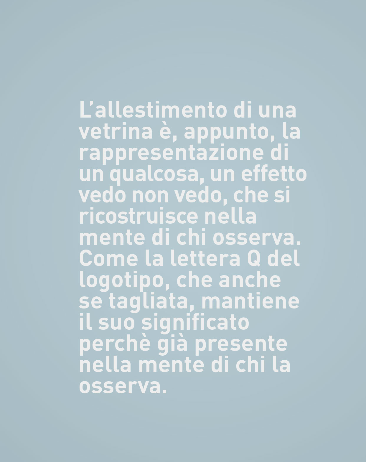L’allestimento di una vetrina è, appunto, la rappresentazione di un qualcosa, un effetto vedo non vedo, che si ricostruisce nella mente di chi osserva. Come la lettera Q del logotipo, che anche se tagliata, mantiene il suo significato perchè gia presente nella mente di chi la osserva.